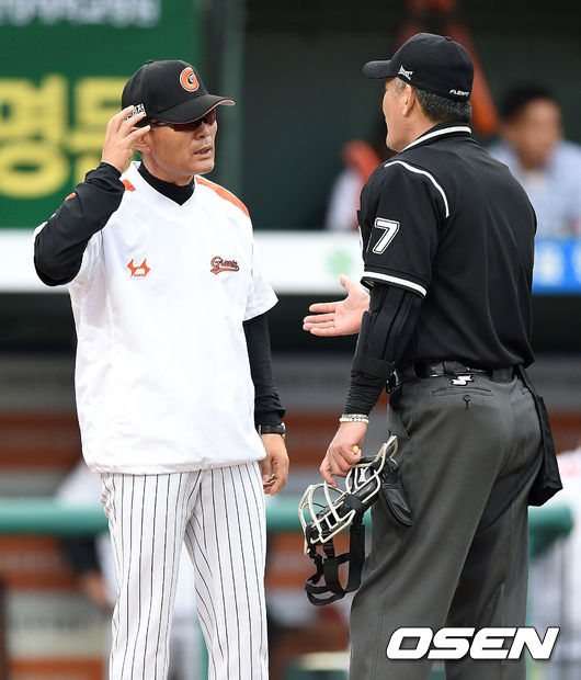 9회초 2사에서 롯데 이종운 감독이 한화 김민우의 몸쪽 볼에 대해 어필하고 있다.