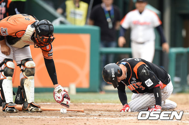 9회초 2사에서 롯데 오승택이 한화 김민우의 투구에 맞고 고통스러워하고 있다.
