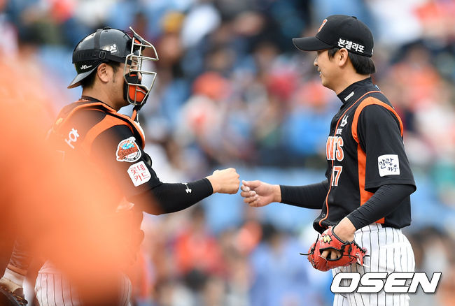 9회말 1사에서 롯데 심수창이 마운드를 내려가며 포수 강민호와 하이파이브를 하고 있다./sunday@osen.co.kr