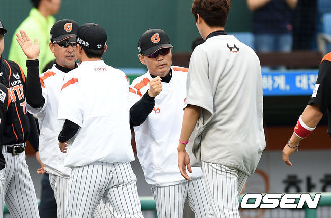 경기 종료 후 롯데 이종운 감독이 선수들과 승리의 기쁨을 나누고 있다./sunday@osen.co.kr