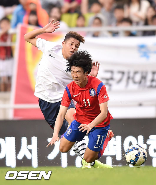 3일 오후 경기도 수원시 수원월드컵경기장에서 열린 '2015 수원 JS컵 U-18 국제청소년축구대회' 한국과 프랑스의 경기, 전반 한국 김정환이 몸싸움 중 넘어지고 있다.