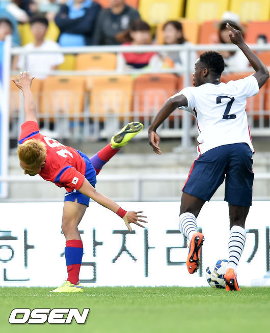 3일 오후 경기도 수원시 수원월드컵경기장에서 열린 '2015 수원 JS컵 U-18 국제청소년축구대회' 한국과 프랑스의 경기, 전반 한국 이승우가 볼을 뺏기고 있다.