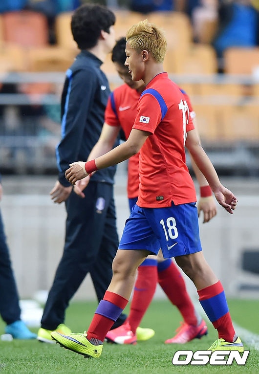 3일 오후 경기도 수원시 수원월드컵경기장에서 열린 '2015 수원 JS컵 U-18 국제청소년축구대회' 한국과 프랑스의 경기, 전반을 마친 한국 이승우가 아쉬운 표정으로 퇴장하고 있다.