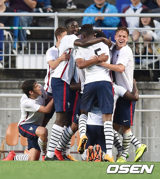 3일 오후 경기도 수원시 수원월드컵경기장에서 열린 '2015 수원 JS컵 U-18 국제청소년축구대회' 한국과 프랑스의 경기, 후반 프랑스 플로리안 아에가 선제골에 성공한 후 동료들과 기쁨을 나누고 있다.