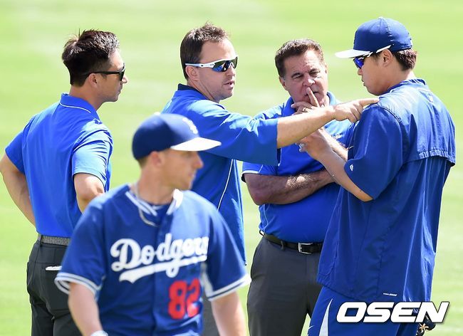 경기 시작에 앞서 다저스 류현진이 트레이너 등 관계자들 앞에서 캐치볼을 마치고 트레이너등 관계자들과 대화를 나누고 있다.