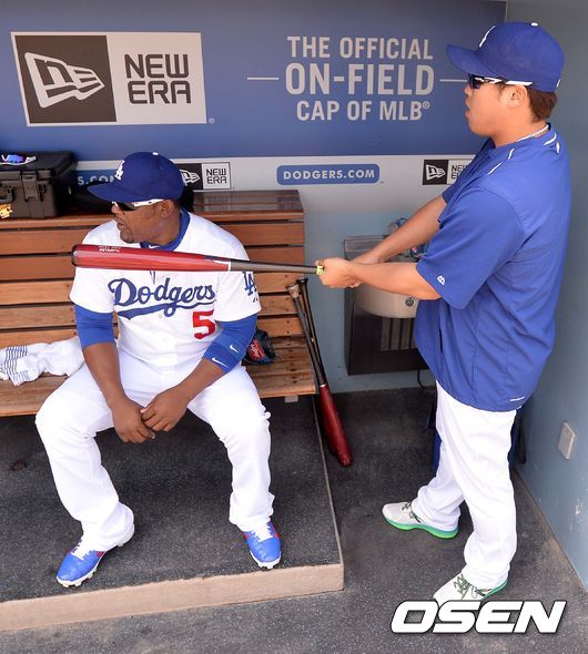 경기 시작에 앞서 다저스 류현진과 유리베가 더그아웃에서 장난을 치고 있다.