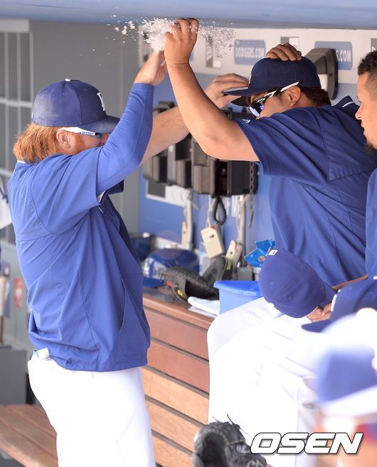 경기 시작에 앞서 다저스 류현진과 저스틴 터너가 더그아웃에서 장난을 치고 있다.