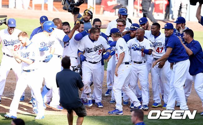 13회말 다저스 공격 선두타자로 나선 야스마니 그란달이 끝내기 좌월 솔로포를 날리고 홈을 밟으며 동료들과 환호하고 있다./dreamer@osen.co.kr