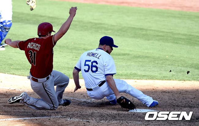 13회초 애리조나 공격 2사 1, 3루 상황 페닝턴 타석 때 다저스 투수 J.P 하웰의 폭투를 틈타 홈으로 쇄도한 3루 주자 파체코가 홈에서 태그아웃 되고 있다./dreamer@osen.co.kr