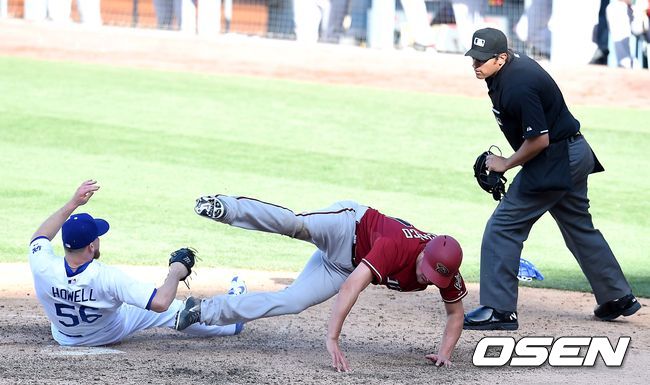 13회초 애리조나 공격 2사 1, 3루 상황 페닝턴 타석 때 다저스 투수 J.P 하웰의 폭투를 틈타 홈으로 쇄도한 3루 주자 파체코가 홈에서 태그아웃 되고 있다./dreamer@osen.co.kr