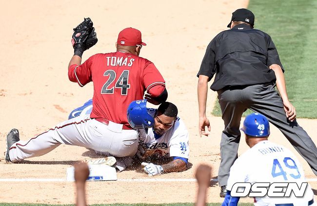 9회말 다저스 공격 1사 주자없는 상황 하위 켄드릭이 우중간 2루타를 날리고 3루까지 내달렸지만 애리조나 3루수 야스마니 토마스의 태그에 걸려 아웃되고 있다./dreamer@osen.co.kr