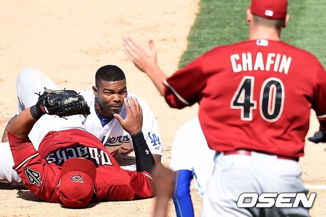 9회말 다저스 공격 1사 주자없는 상황 하위 켄드릭이 우중간 2루타를 날리고 3루까지 내달렸지만 애리조나 3루수 야스마니 토마스의 태그에 걸려 아웃된 뒤 아쉬워하고 있다./dreamer@osen.co.kr