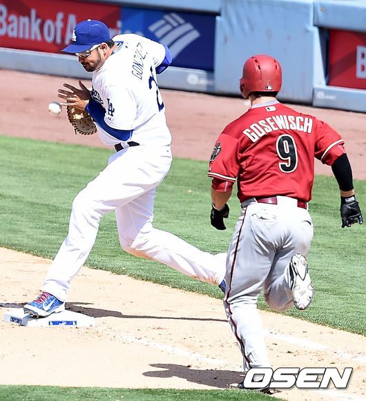 8회초 애리조나 공격 1사 주자없는 상황 고스비쉬의 땅볼 타구 때 다저스 1루수 곤살레스가 푸이그의 원바운드 송구를 받아내고 있다./dreamer@osen.co.kr