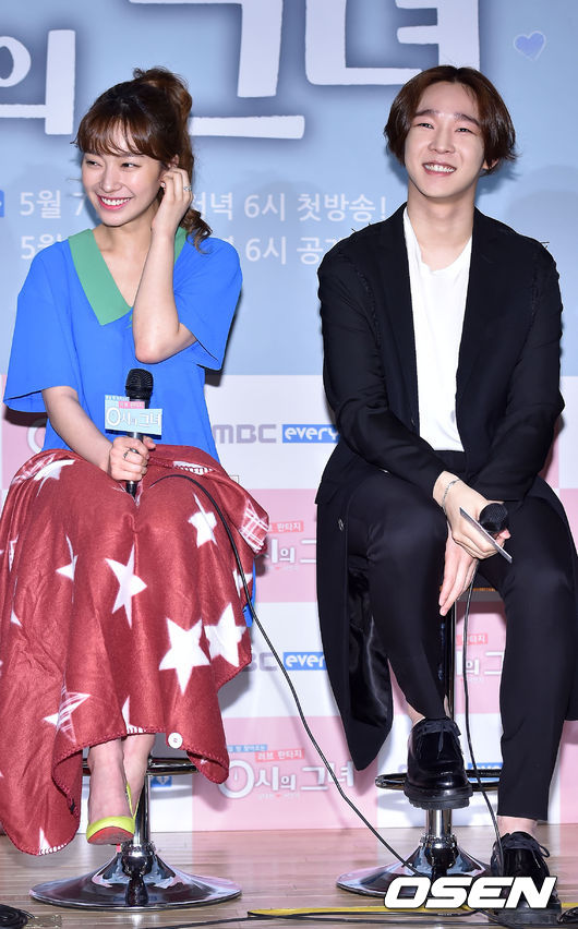 4일 오후 경기도 고양시 일산MBC 드림센터에서 열린 mbc 에브리원 '0시의 그녀' (극본 윤진, 연출 이철민) 제작발표회서 남태현과 서민지가 키스신에 대한 질문에 난감해 하고 있다.