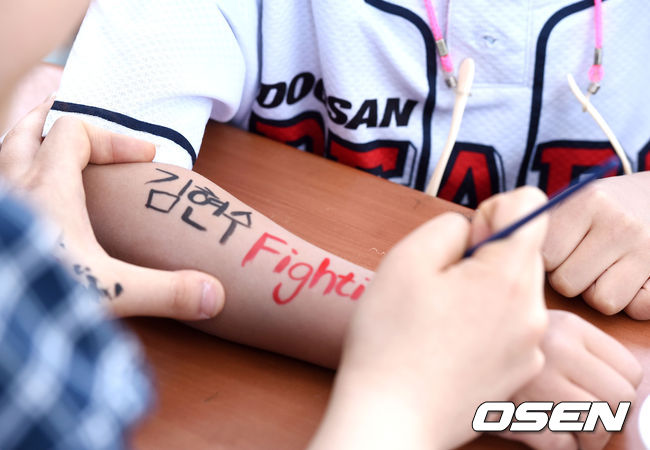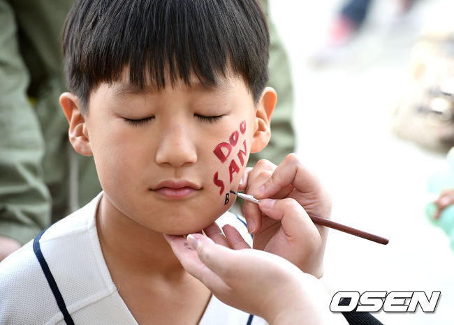 두산 어린이 팬이 페이스 패인팅을 하고 있다.