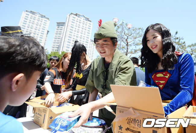 5일 오후 부산 사직구장서 '2015 타이어뱅크 KBO 리그' 롯데 자이언츠와 SK 와이번스의 경기가 열릴 예정인 가운데, 롯데 이창원 롯데자이언츠 대표이사가 김진아 치어리더와 함께 어린이들에게 아이스크림을 나눠주고 있다.