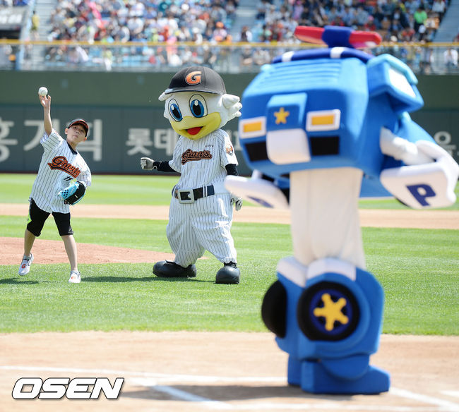 5일 오후 부산 사직구장서 열린 '2015 타이어뱅크 KBO 리그' 롯데 자이언츠와 SK 와이번스의 경기, 경기 전 시구자인 이병희 어린이가 로보카 폴리를 향해 힘차게 공을 뿌리고 있다.