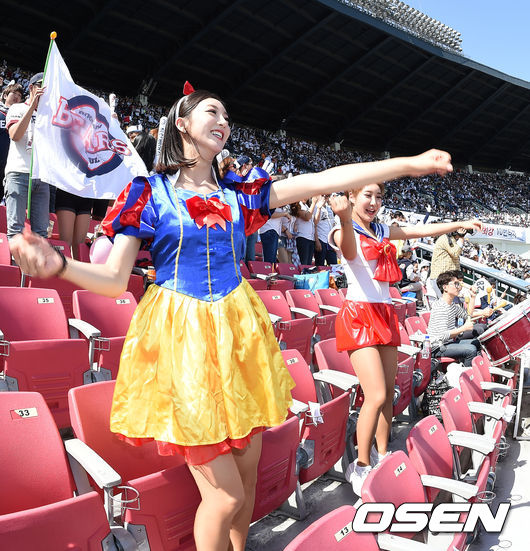 두산 치어리더가 백설공주, 세일러문으로 코스프레, 열띤 응원을 선보이고 있다.