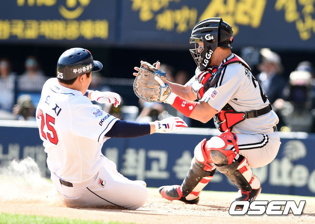4회말 1사 만루에서 두산 양의지가 김재호의 희생플라이에 태그업, LG 최경철의 태그에 앞서 세이프되고 있다.