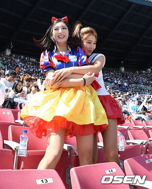 두산 치어리더가 백설공주, 세일러문으로 코스프레, 열띤 응원을 선보이고 있다.