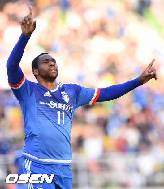 전반전 수원 레오가 동점골을 성공시키고 세리머니 하고 있다.
