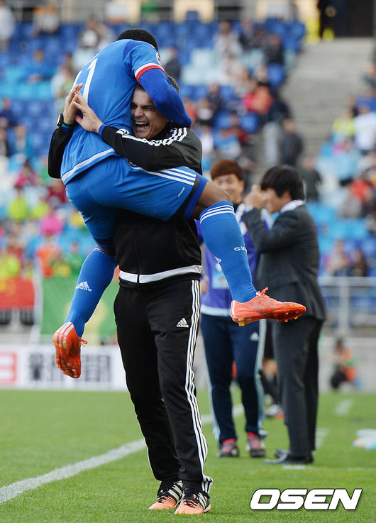 전반전 수원 레오가 동점골을 성공시키고 코치와 포옹을 나누고 있다.