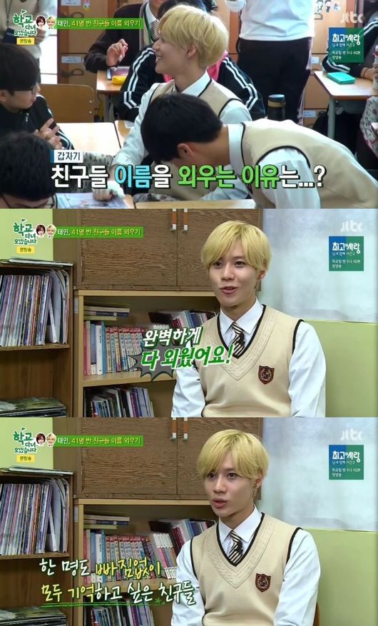 태민은 5일 방송된 JTBC '학교 다녀오겠습니다'에서 "대혁이, 아름이, 너는 태연이가 좋아하는 애, 수빈이"라며 같은 방 학생 41명의 이름을 다 외웠다.
