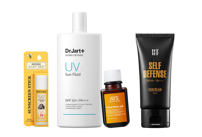 왼쪽부터 버츠비 베이비 비 내츄럴 선스크린 스틱, 닥터자르트 더마 디펜스 선 플루이드, ATS 스타일뮤즈 리액션 오일, DTRT 셀프 디펜스 제공