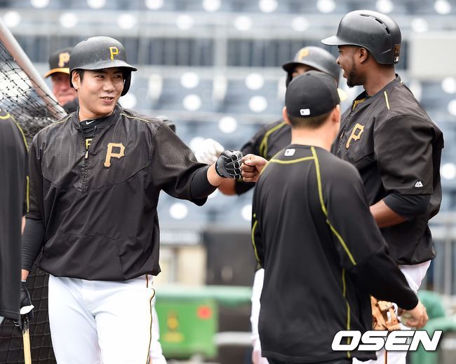 6일(한국시간) 미국 펜실베니아주 PNC파크에서 열리는 '2015 메이저리그' 피츠버그 파이어리츠와 신시내티 레즈와의 경기를 앞두고, 강정호가 타격 훈련 중 동료들과 대화를 나누고 있다.