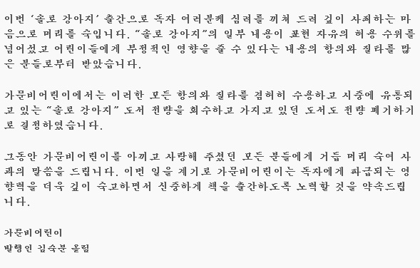 이어 "가문비어린이에서는 이러한 모든 항의와 질타를 겸허히 수용하고 시중에 유통되고 있는 '솔로 강아지' 도서 전량을 회수하고 가지고 있던 도서도 전량 폐기하기로 결정했다"고 밝혔다.