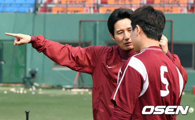 경기전 넥센 염경엽 감독이 김지수와 이야기를 나누고 있다.