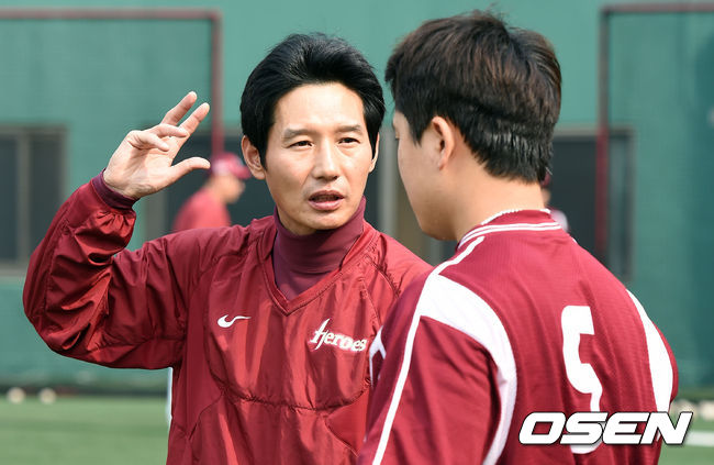 경기전 넥센 염경엽 감독이 김지수와 이야기를 나누고 있다.