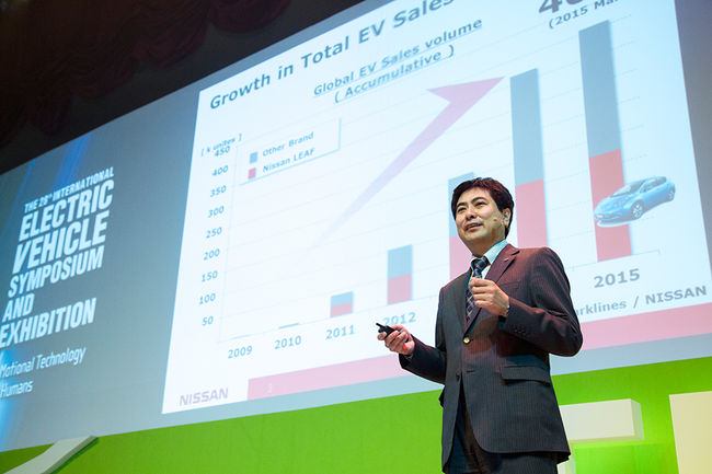 이날 야지마 카즈오(Yajima Kazuo) 닛산자동차 전기-하이브리드차(EV-HEV) 얼라이언스 글로벌 총괄이 닛산을 대표해 발표를 맡았다. 야지마 총괄은 "2015년 3월 기준으로 전기차는 전 세계 누적 40만대 이상 판매됐다"며 "그 중 닛산 리프(LEAF)가 17만 2000여대로 시장의 절반 가까이 차지, 뛰어난 상품성을 세계적으로 인정받고 있다"고 전기차 시장에서 닛산의 리더십을 강조했다.