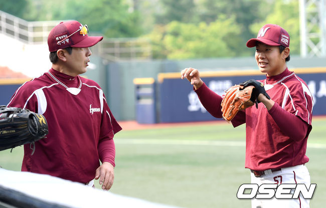 경기전 넥센 송성문이 홍원기 코치와 훈련을 마친 뒤 이야기를 나누고 있다.