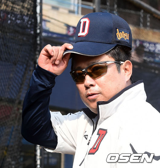 경기에 앞서 두산 김태형 감독이 더그아웃으로 향하며 취재진에 인사를 하고 있다.