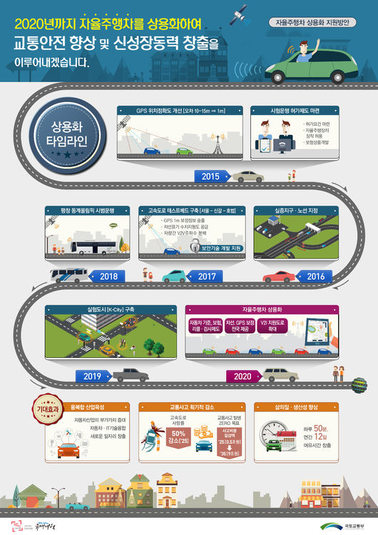국토부는 자율주행 자동차 상용화로 산업 융복합에 따른 부가가치 제고, 일자리 창출 2025년 고속도로 사망률 50% 감소 및 교통사고비용 약 5000억 원 절감 , 하루 평균 50분, 연간 12일의 여유시간 창출 효과가 있을 것으로 기대하고 있다.
