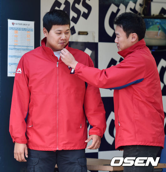 6일 오후 창원시 마산 야구장서 '2015 타이어뱅크 KBO 리그' NC 다이노스와 KIA 타이거즈의 경기가 열릴 예정인 가운데, 양 팀 훈련시간에 한화에서 KIA로 이적한 투수 김광수 유창식이 점퍼를 만져주고 있다.