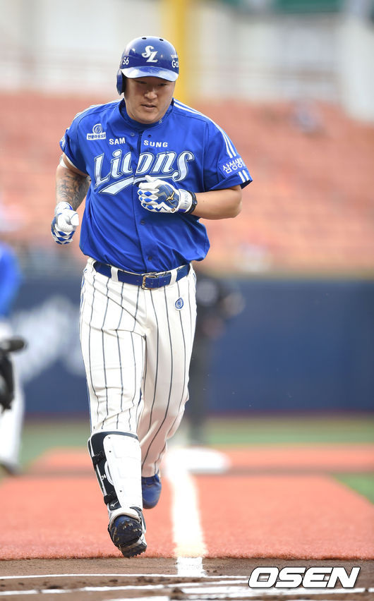1회초 2사 1루 삼성 최형우가 투런 홈런을 때린 뒤 베이스를 돌고 있다.