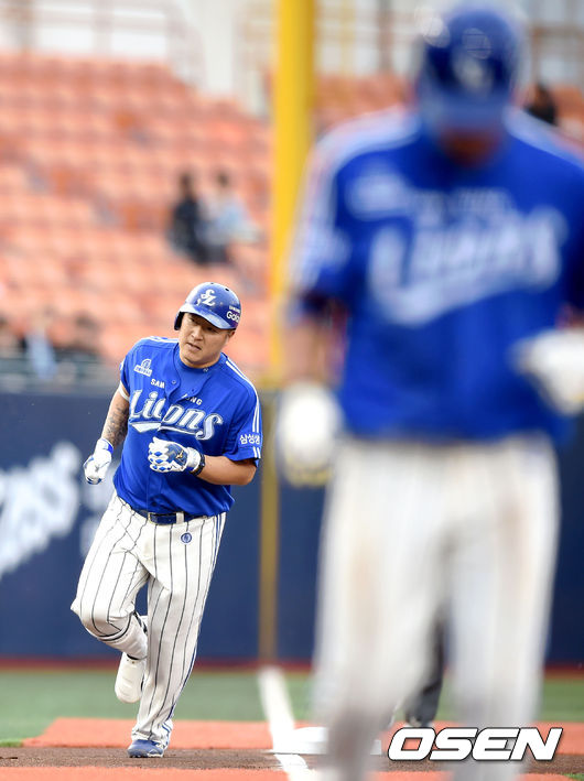 1회초 2사 1루 삼성 최형우가 투런 홈런을 때린 뒤 베이스를 돌고 있다.