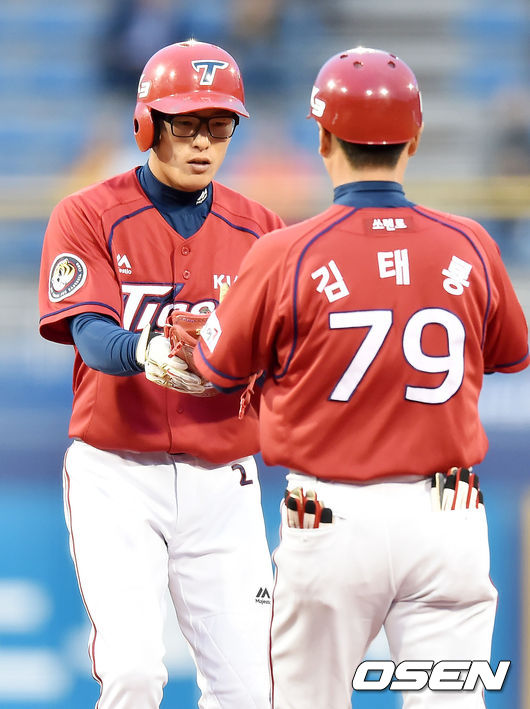 6일 오후 창원시 마산 야구장서 열린 '2015 타이어뱅크 KBO 리그' NC 다이노스와 KIA 타이거즈의 경기, 2회초 1사 주자 없는 상황에서 오늘 한화에서 KIA로 트레이드 된 노수광이 홍건희 유니폼을 입고 우중간 2루타를 날린 후 2루에서 김태룡 코치와 하이파이브를 하고 있다.