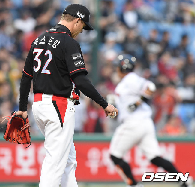 6일 오후 대전 한화생명 이글스 파크에서 열린 '2015 타이어뱅크 KBO 리그' 한화 이글스와 kt 위즈의 경기 2회말 2사 1루 조인성에게 투런포를 허용한 옥스프링이 고개를 숙이고 있다.