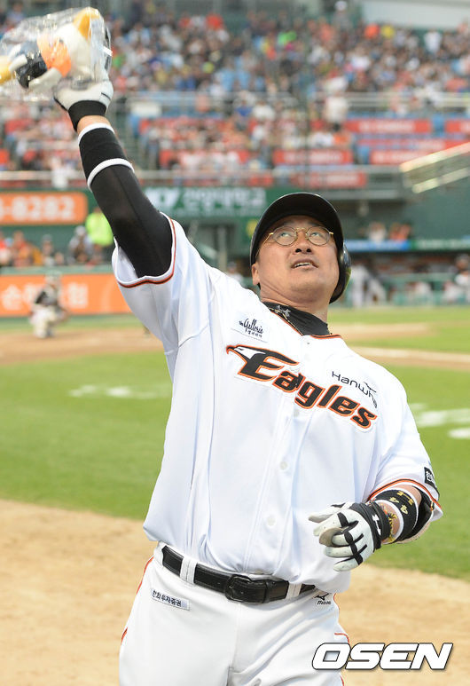 6일 오후 대전 한화생명 이글스 파크에서 열린 '2015 타이어뱅크 KBO 리그' 한화 이글스와 kt 위즈의 경기 2회말 2사 1루 조인성이 투런홈런을 치고 덕아웃에서 관중석으로 향해 인형을 던져주고 있다.