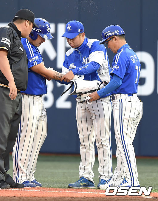 3회초 2사 1,3루 삼성 최형우가 자신의 부러진 배트에 맞은 뒤 치료를 받고 있다.