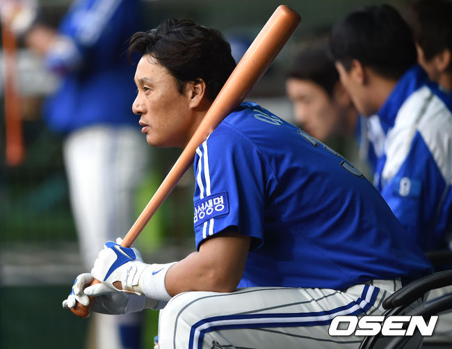 삼성 이승엽이 벤치에 앉아 경기를 지켜보고 있다.