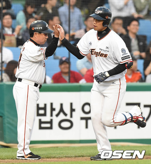 6일 오후 대전 한화생명 이글스 파크에서 열린 '2015 타이어뱅크 KBO 리그' 한화 이글스와 kt 위즈의 경기 2회말 1사 최진행이 솔로홈런을 치고 김광수 코치와 하이파이브를 하고 있다.