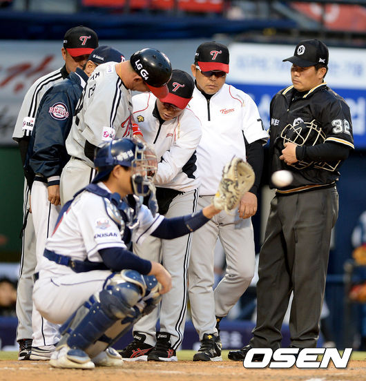 2회초 1사 1,3루에서 LG 손주인이 두산 니퍼트의 투구에 손목을 맞자 양상문 감독이 그라운드로 나와 상태를 살피고 있다.