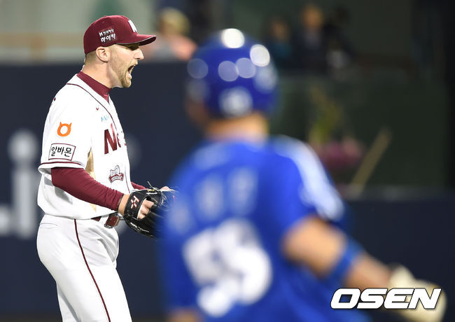 4회초 1사 만루 넥센 피어밴드가 삼성 우동균을 병살로 잡아낸 뒤 포요하고 있다.