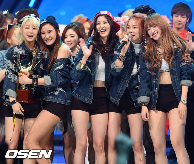 6일 오후 경기도 일산동구 장항동 MBC드림센터에서 열린 MBC 뮤직 ‘쇼 챔피언(Show Champion)’ 생방송에서 그룹 EXID가 1위 발표에 기뻐하고 있다.