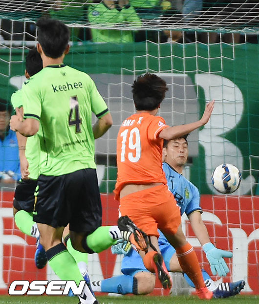 전반전 전북 권순태 골키퍼가 산둥 Xu의 슛을 막아내고 있다.