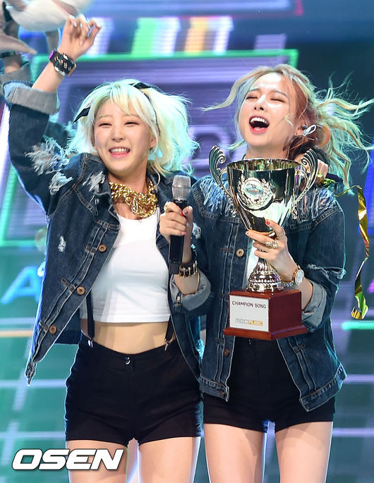 6일 오후 경기도 일산동구 장항동 MBC드림센터에서 열린 MBC 뮤직 ‘쇼 챔피언(Show Champion)’ 생방송에서 그룹 EXID가 1위 발표에 기뻐하고 있다.